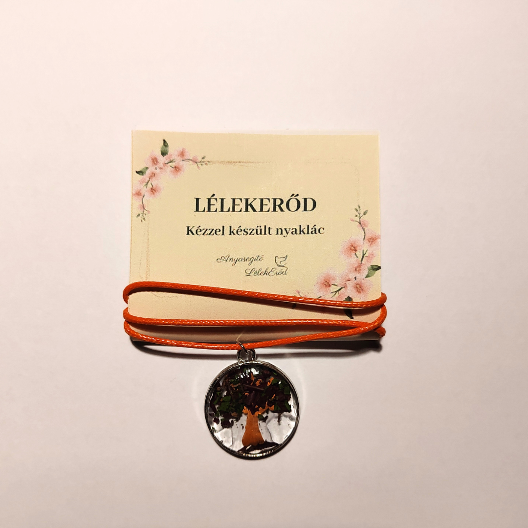 LélekErőd kézzel készült nyaklánc, amely az őszi Életfa motívumával a természet körforgását és az élet erejét szimbolizálja. A narancsszínű zsinór a melegséget és energiát hordozza, míg a gyantába öntött Életfa medál az állandóság és megújulás üzenetét közvetíti. Egyedi, természetközeli ékszer, amely segít megőrizni a belső harmóniát és lelki erőt a mindennapokban.