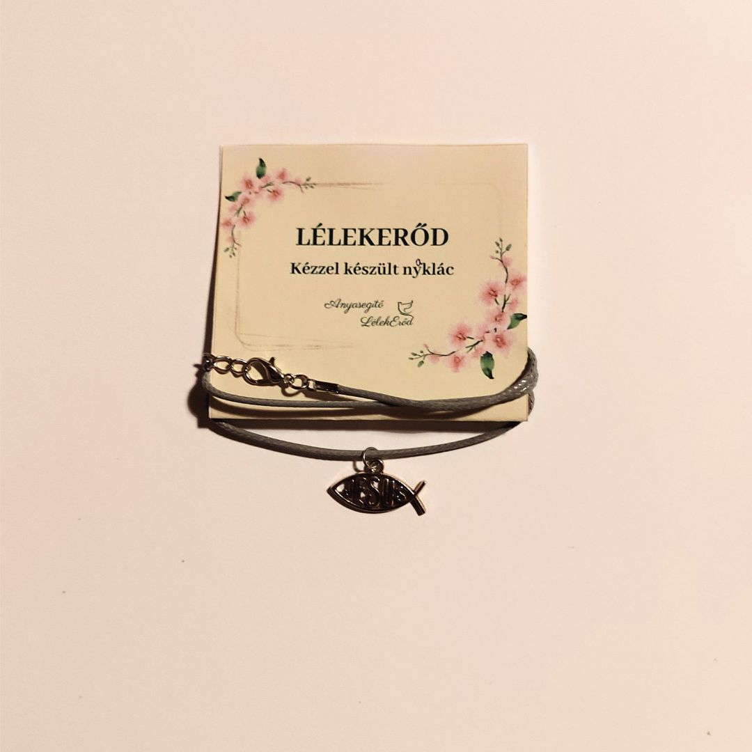Hal alakú kereszt motívum szürke zsinóron. A LélekErőd kollekcióban a keresztény hit jele, amely emlékeztet arra, hogy Jézus követése csendes tanúságtétel is lehet.