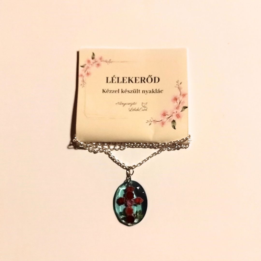 Rózsákból álló kereszt medál, ezüst színű láncon. Kézzel készült LélekErőd ékszer.