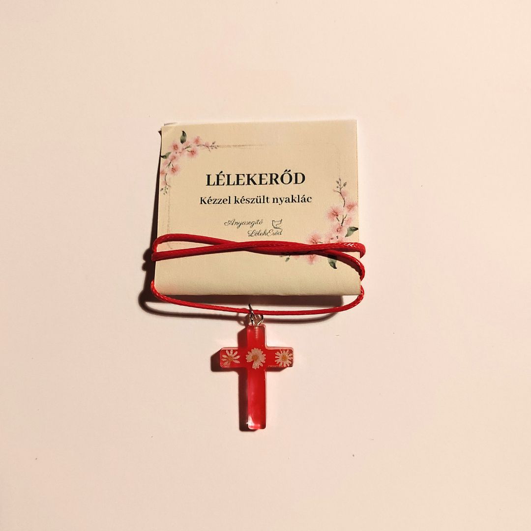 Ez a kézzel készült nyaklánc egy áttetsző piros kereszt alakú medált tartalmaz, amelyet finom fehér virágmotívum díszít. A piros zsinór az élet erejét és a szeretet melegségét idézi. A LélekErőd kollekcióban ez az ékszer Krisztus áldozatára és az isteni szeretet gyógyító erejére emlékeztet. A virágok a tisztaságot és az új élet ígéretét hordozzák. Viselőjét arra hívja, hogy szívében hordozza a keresztet, és tanúságot tegyen arról, hogy Isten szeretete minden seb fölött gyógyító fényként ragyog.