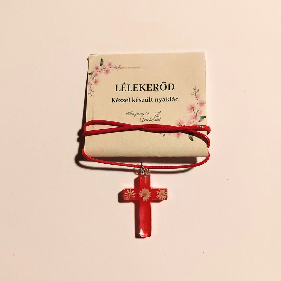Ez a kézzel készült nyaklánc egy piros kereszt alakú medált tartalmaz, amelyet fehér virágdíszítés tesz élővé. A piros zsinór melegséget és energiát sugároz, miközben a kereszt forma Krisztus áldozatára és szeretetére emlékeztet. A LélekErőd kollekcióban ez az ékszer az öröm és a tanúságtétel szimbóluma: viselőjét arra hívja, hogy Isten világosságát ne csak hordozza, hanem sugározza is tovább. A virágok az élet szépségét, a nap pedig az isteni fényt idézi meg, amely minden sötétséget képes átjárni.