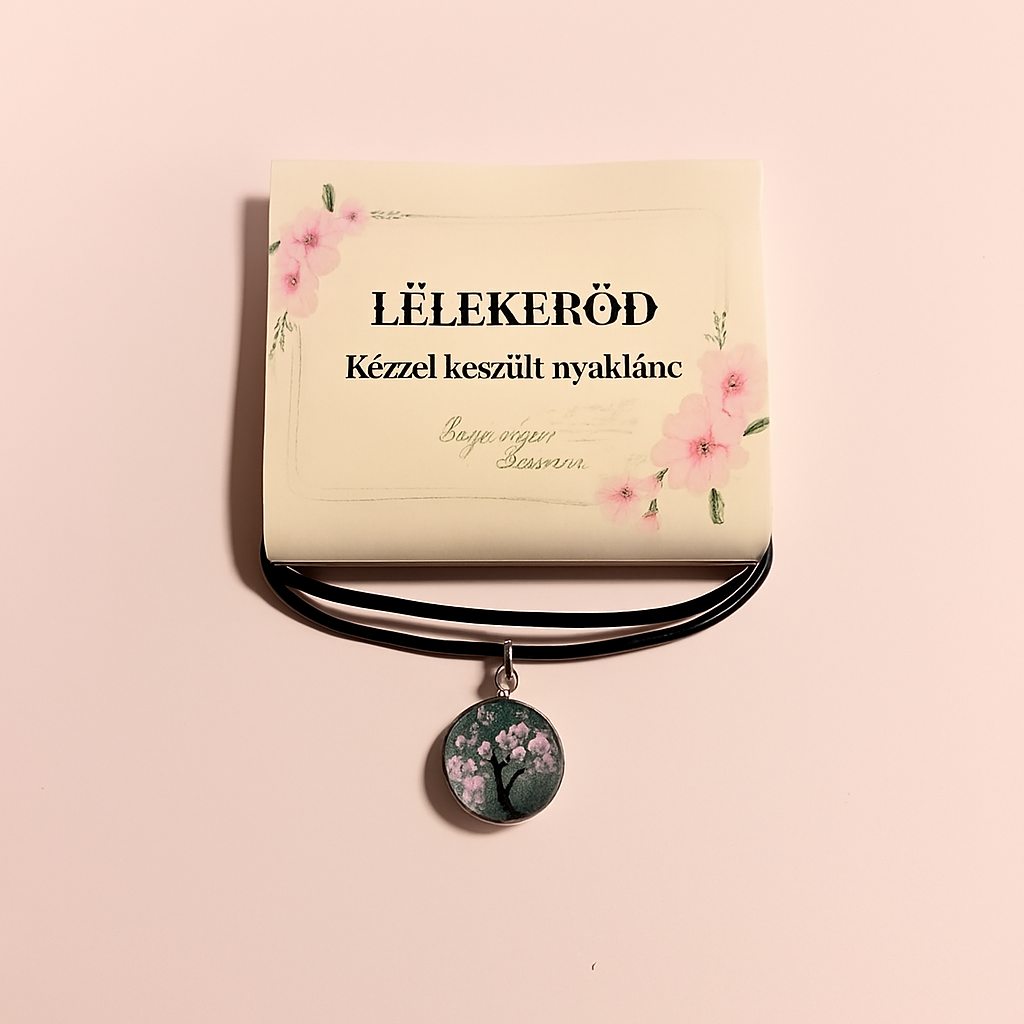 A rózsaszín lombos életfa motívum epoxi gyanta medálban, fekete zsinóron a LélekErőd kollekcióban az Istenbe vetett bizalom jelképe.